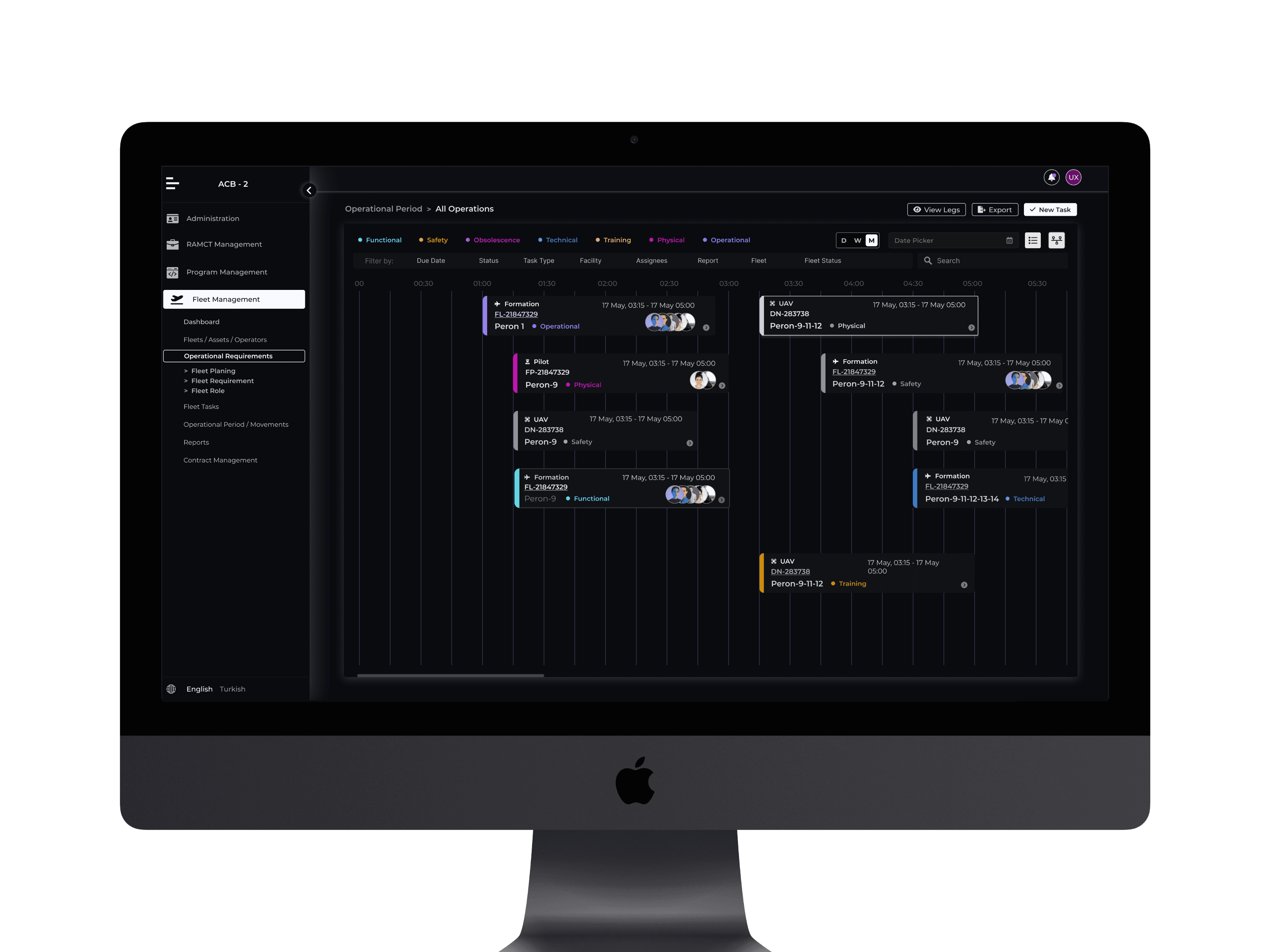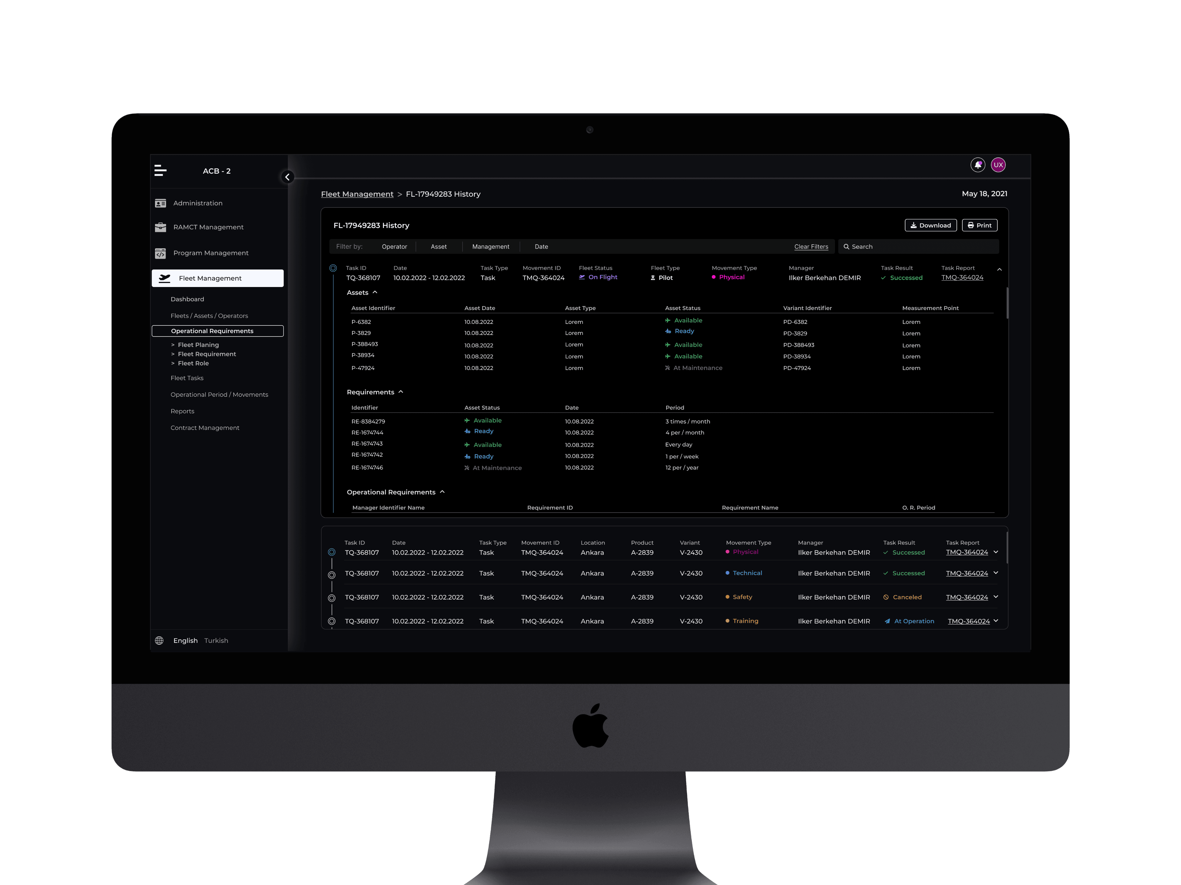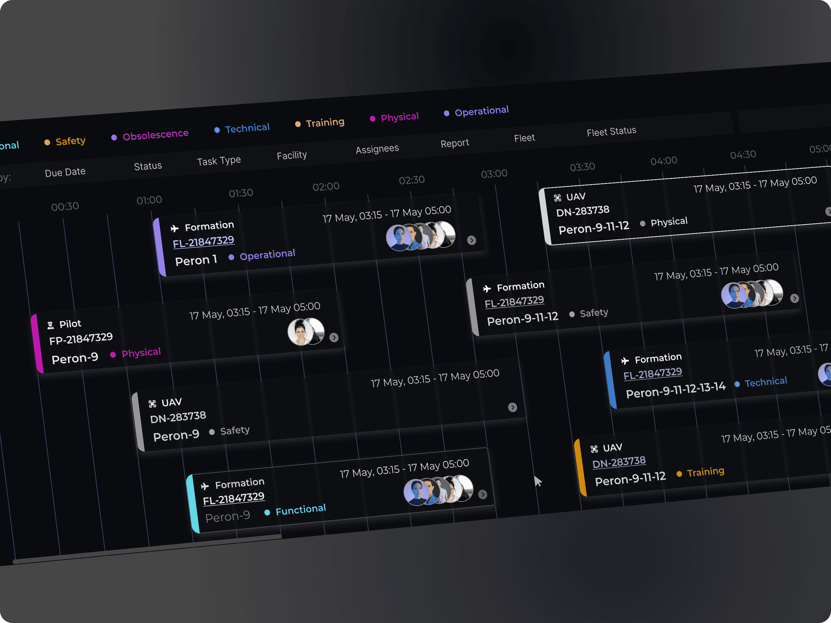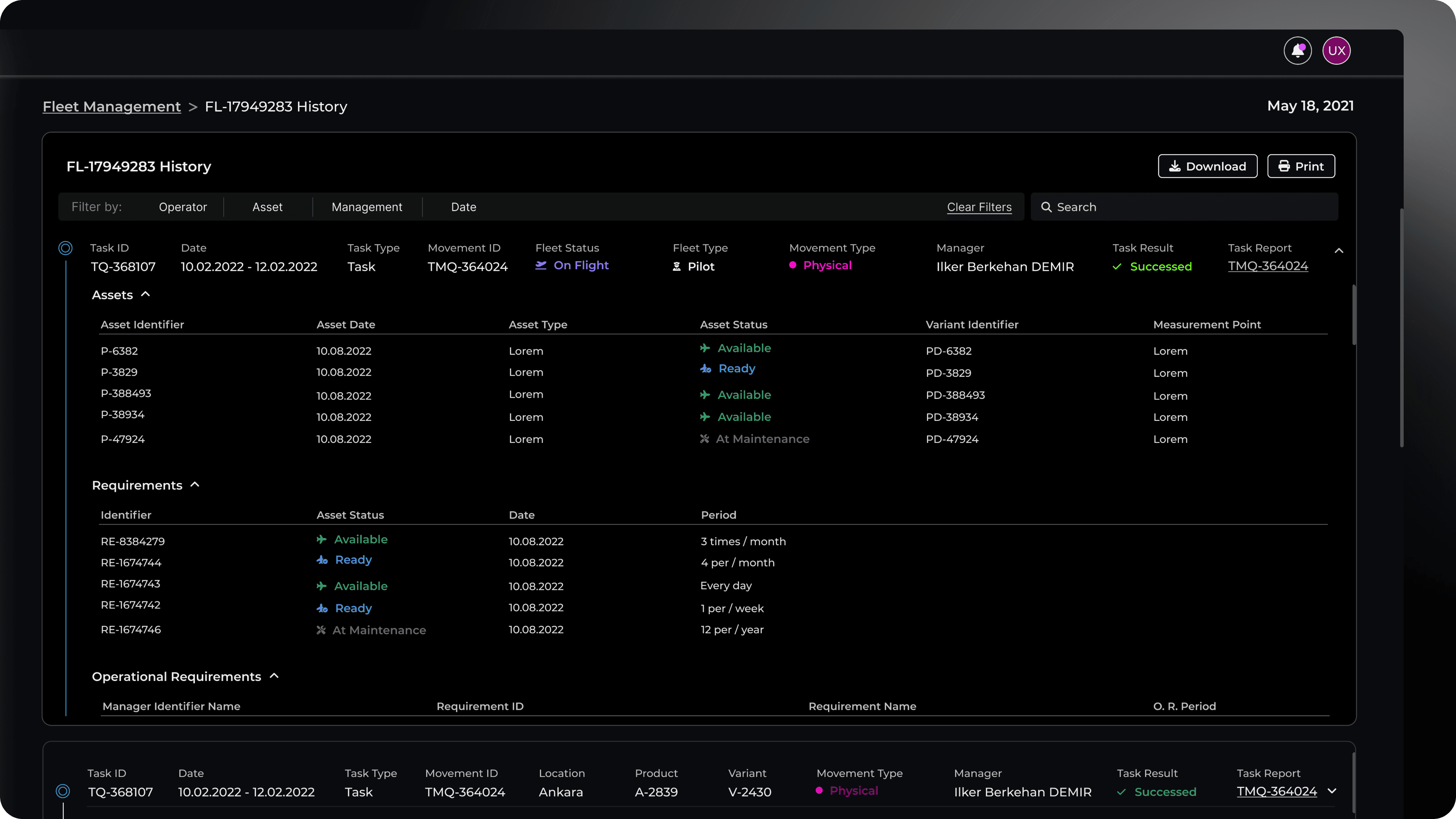 At a more granular level, users can explore details such as assets, requirements, and operational requirements, along with movement type, task outcomes, and a direct link to the task report. This structured approach ensures that users can efficiently track, analyze, and manage fleet operations in real time.