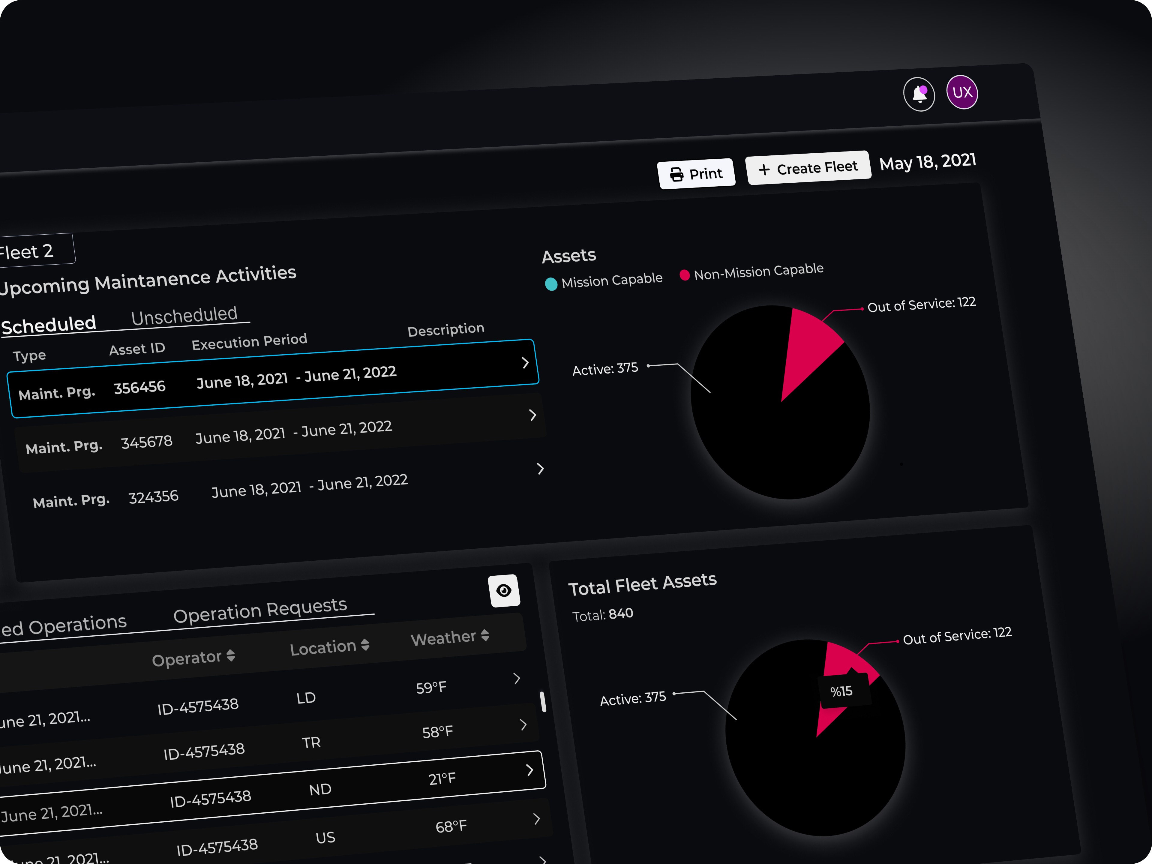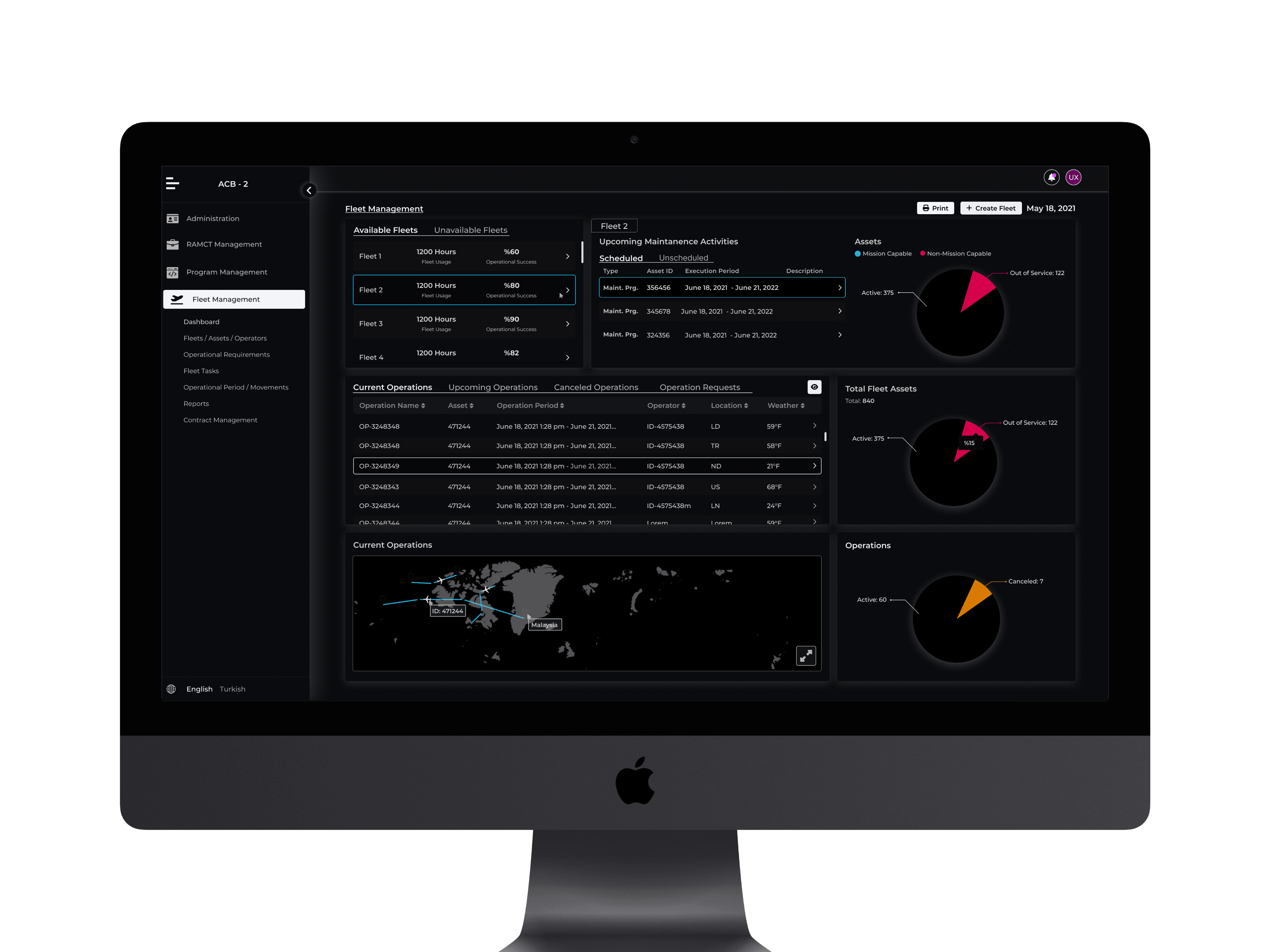 Users access a dashboard displaying fleet status, availability, and operational readiness. Fleet assets are categorized based on type, location, and usage.