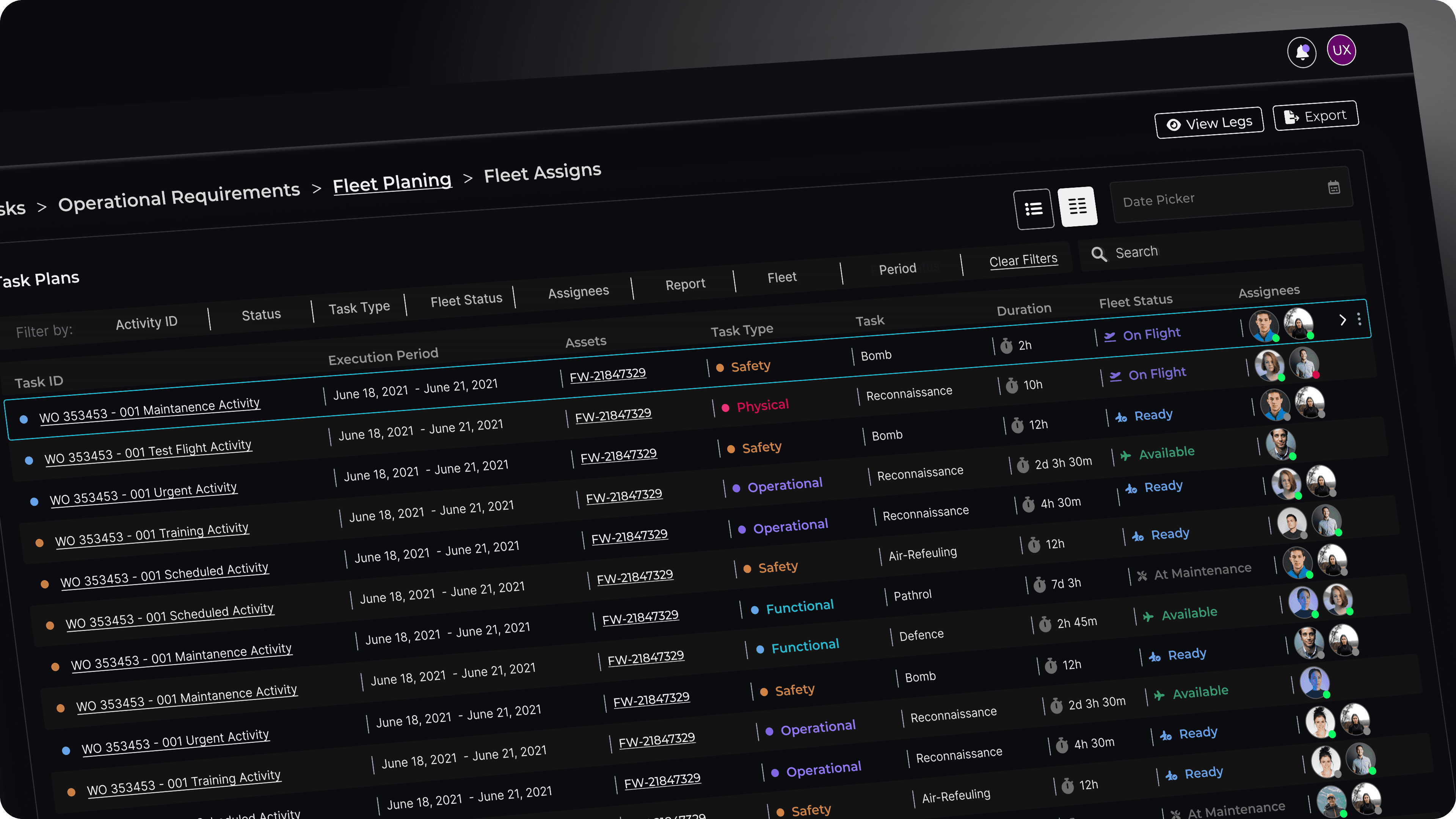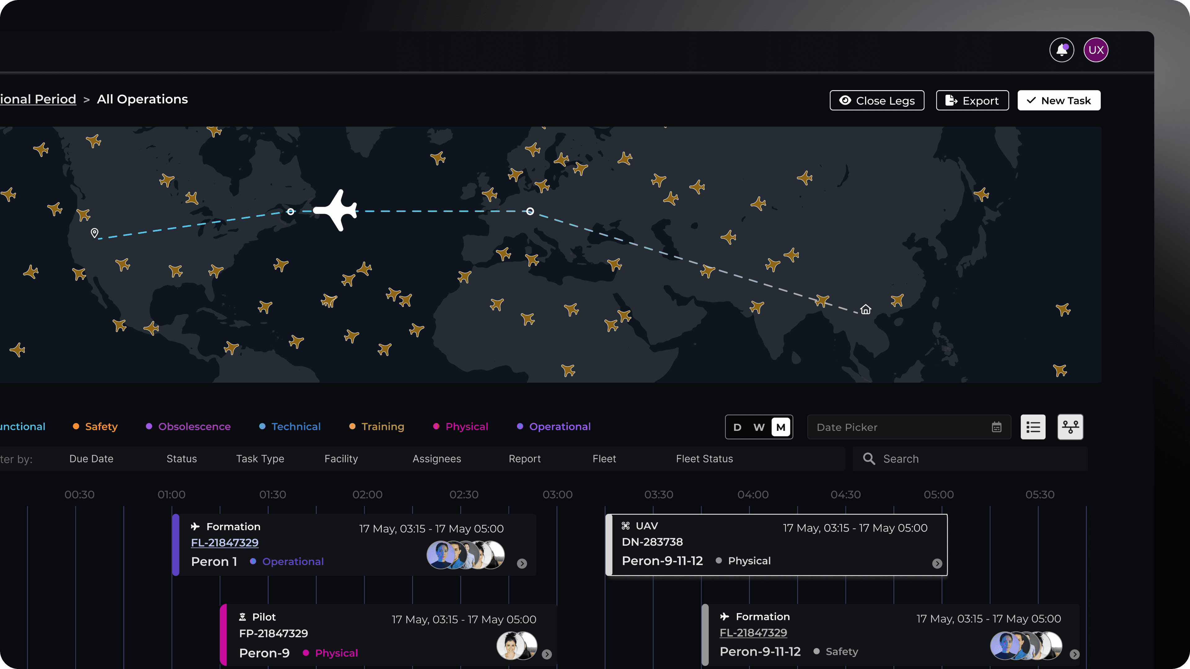 The Fleet Assignment page is designed to provide seamless task selection and real-time tracking within a structured timeline. Users can select a task from the top section, which dynamically highlights its position within the timeline below. This enables quick identification of the task’s status and progress.