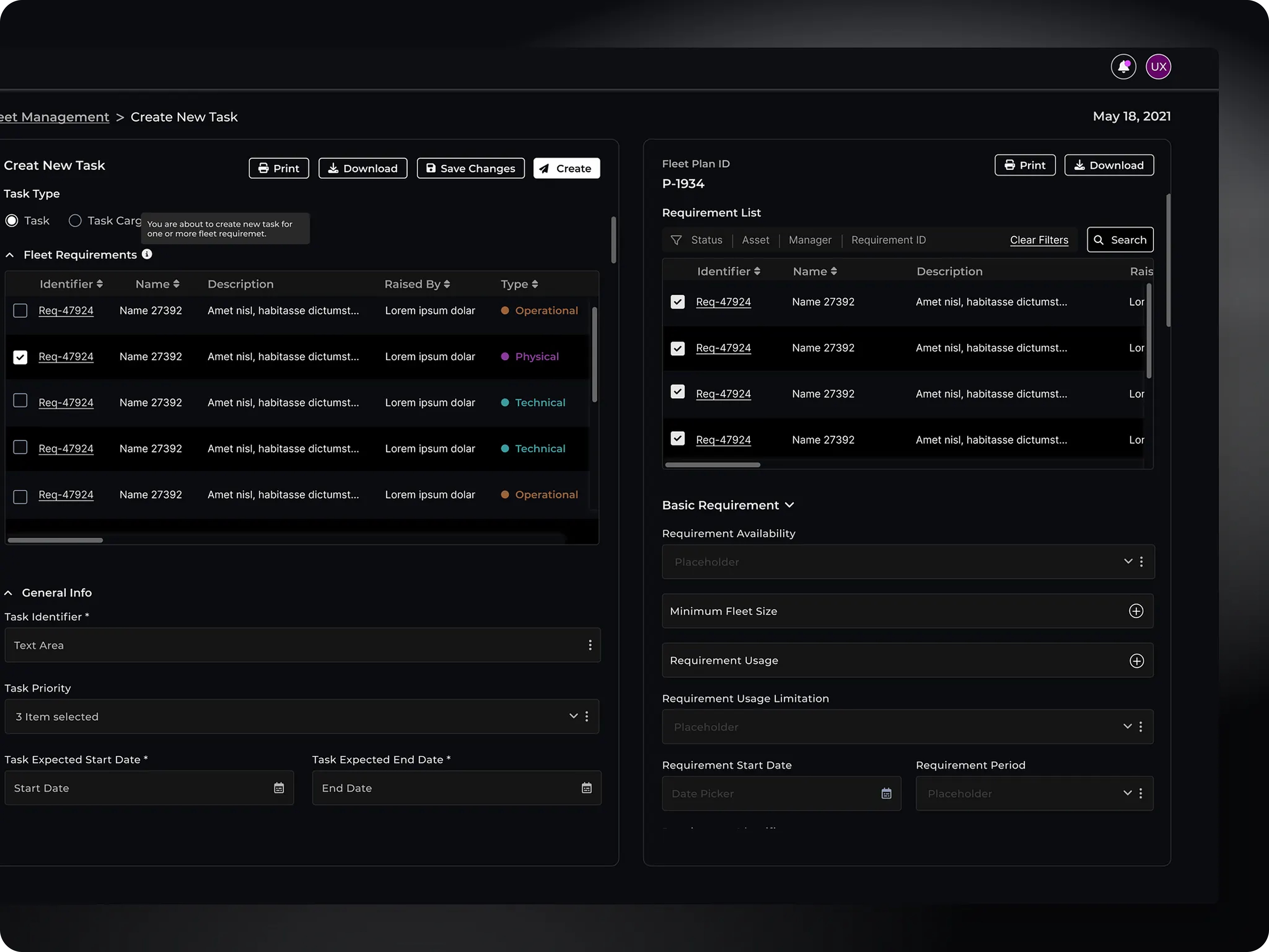 Fleet Requirement – Select required assets such as vehicles, personnel, and equipment.