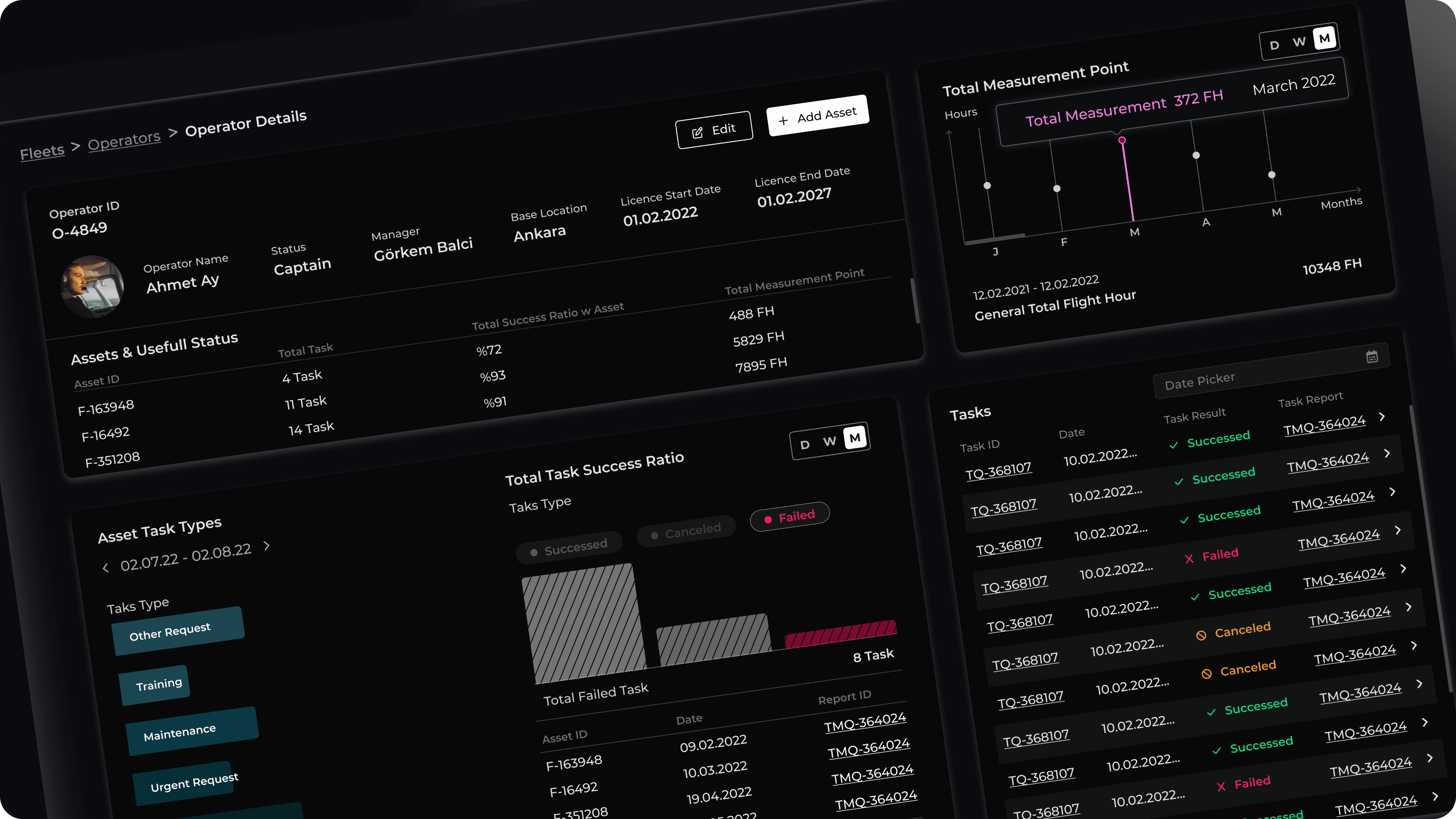The page also presents task-related insights, including the types of asset tasks performed and total task success ratios. A content switcher enables users to analyze data daily, weekly, or monthly, allowing for flexible performance tracking.
