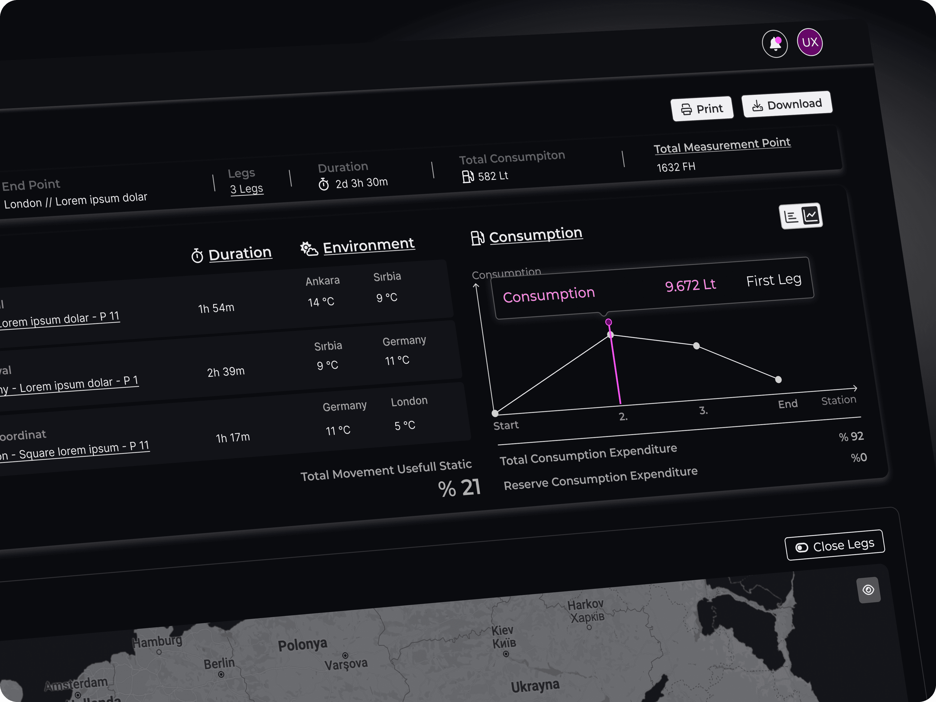 Segment-Specific Fuel Analysis: Users can interact with individual route legs to reveal a line chart displaying fuel consumption trends, enhancing operational efficiency and resource planning.